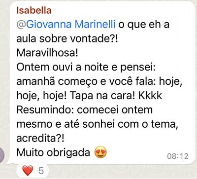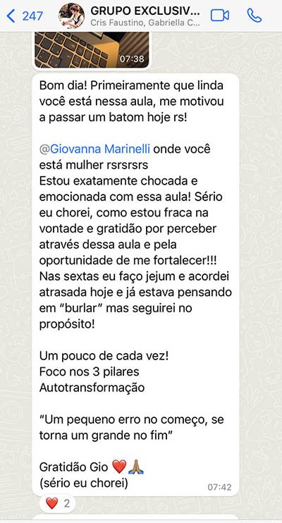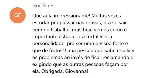 O homem tem, naturalmente, o desejo de conhecer, podemos usar este “impulso” para conhecer boas obras e bons mestres, é por isso que a Giovanna faz questão de apresentar às alunas o que há de melhor. Em suas aulas, ela une o estudo, a espiritualidade e a prática cotidiana e que verdadeiro crescimento começa dentro de casa.
